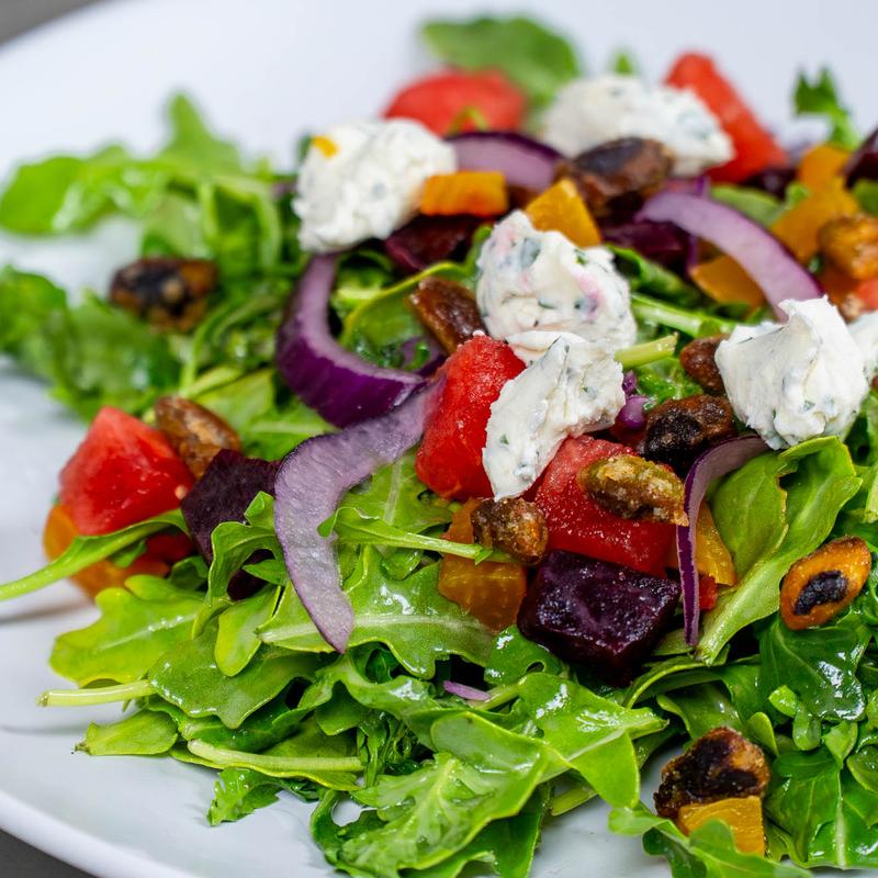 Watermelon, red onion, candied pistachios, herb goat cheese, citrus vinaigrette.